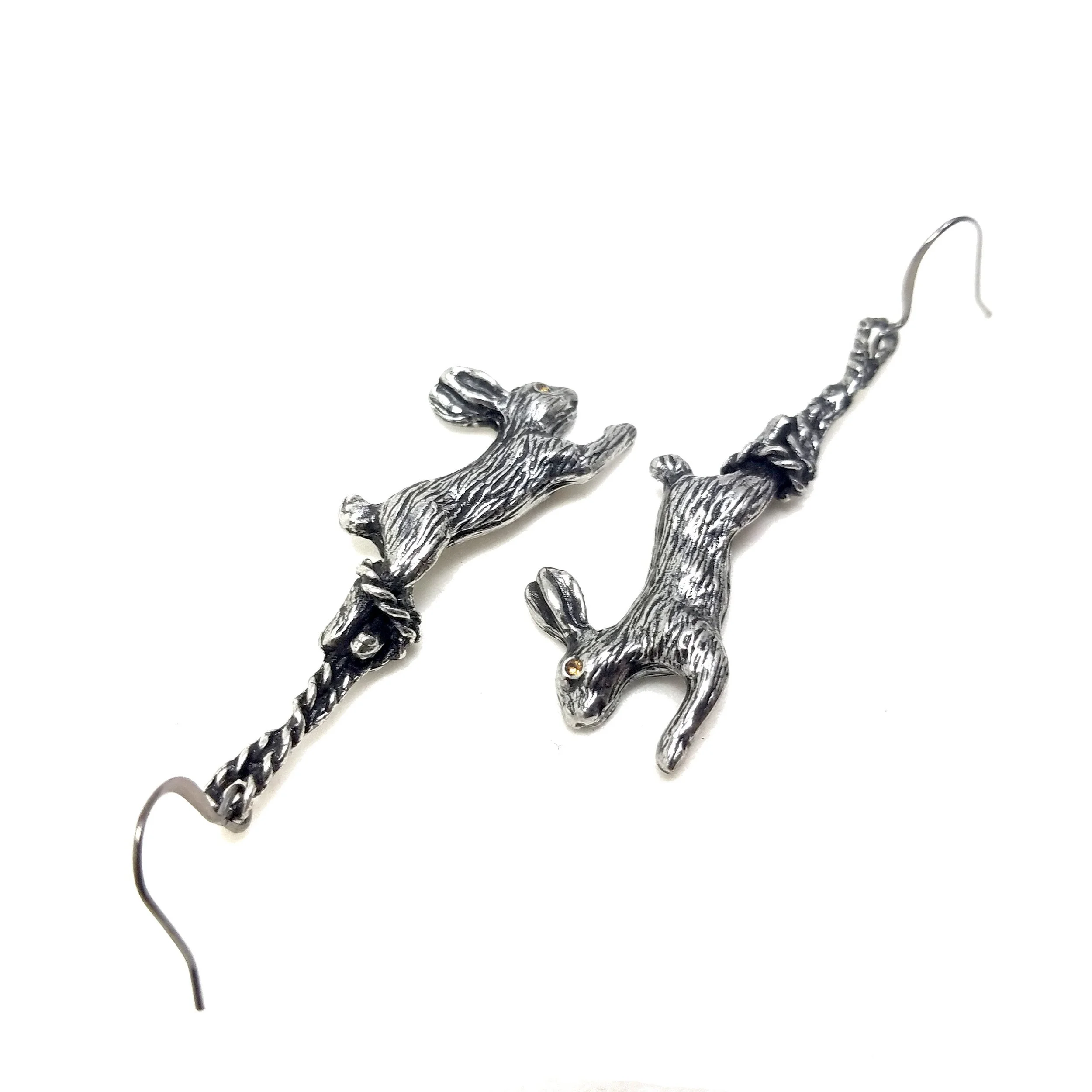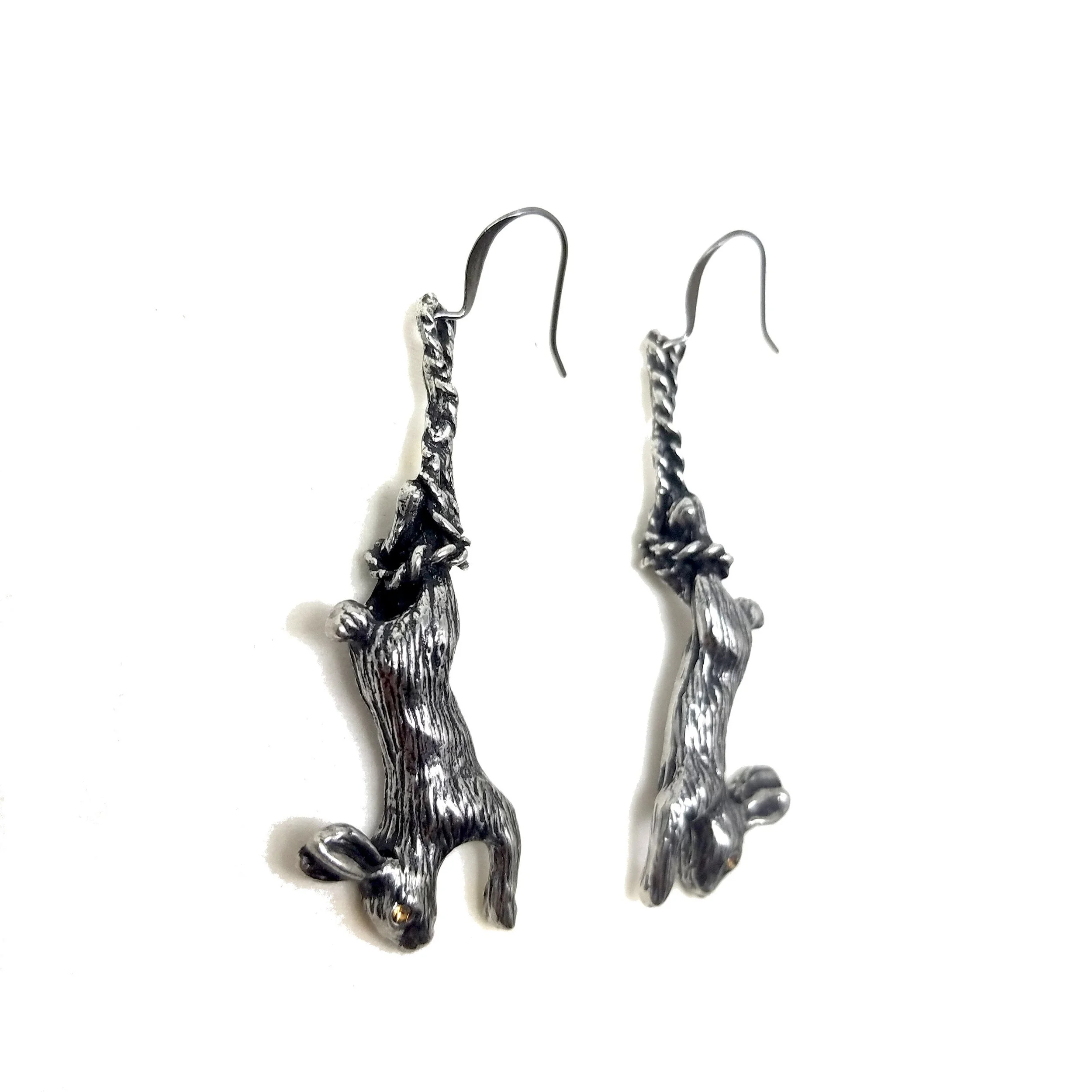 Lead-free pewter cast barn owl claw drop earrings with dark gray or black crystals