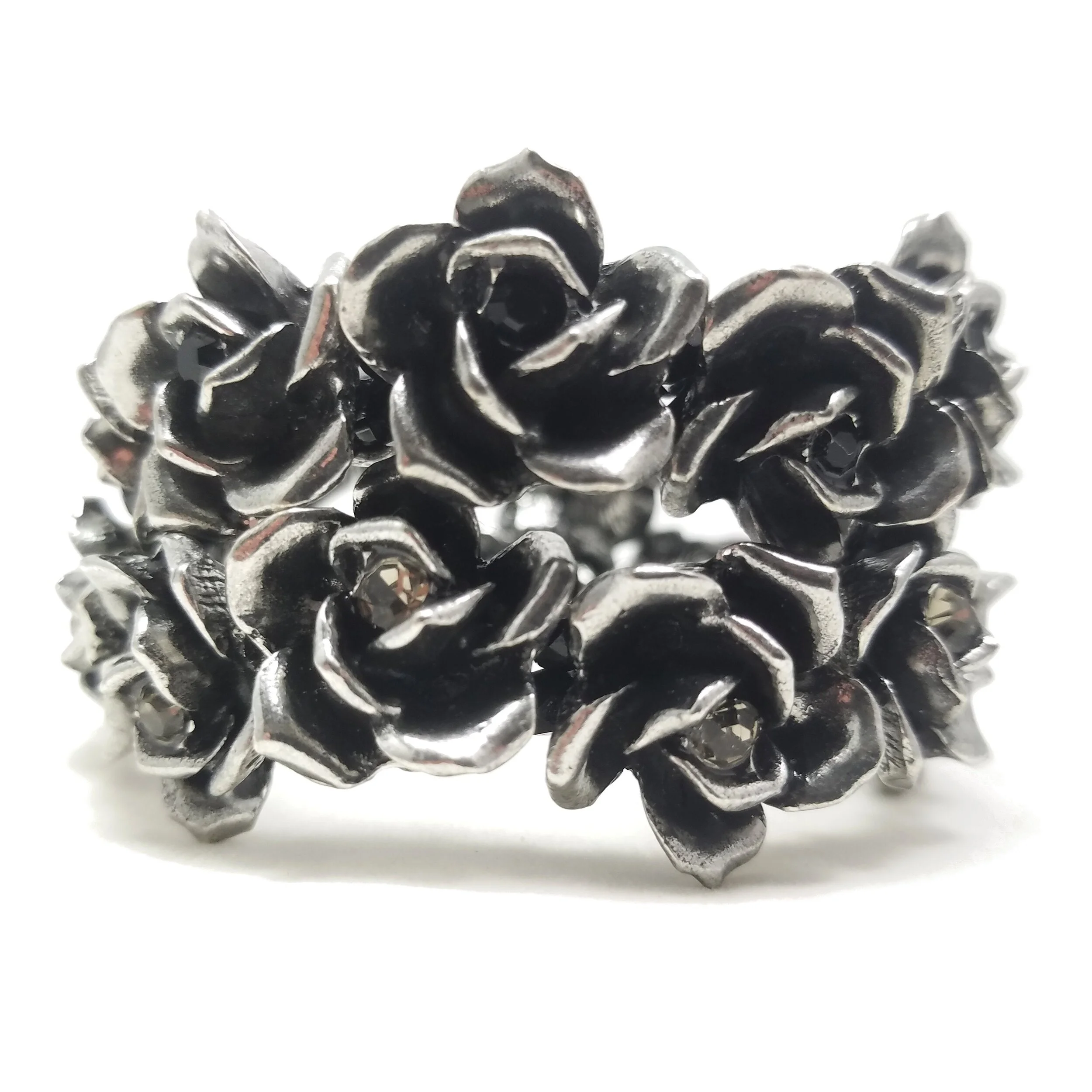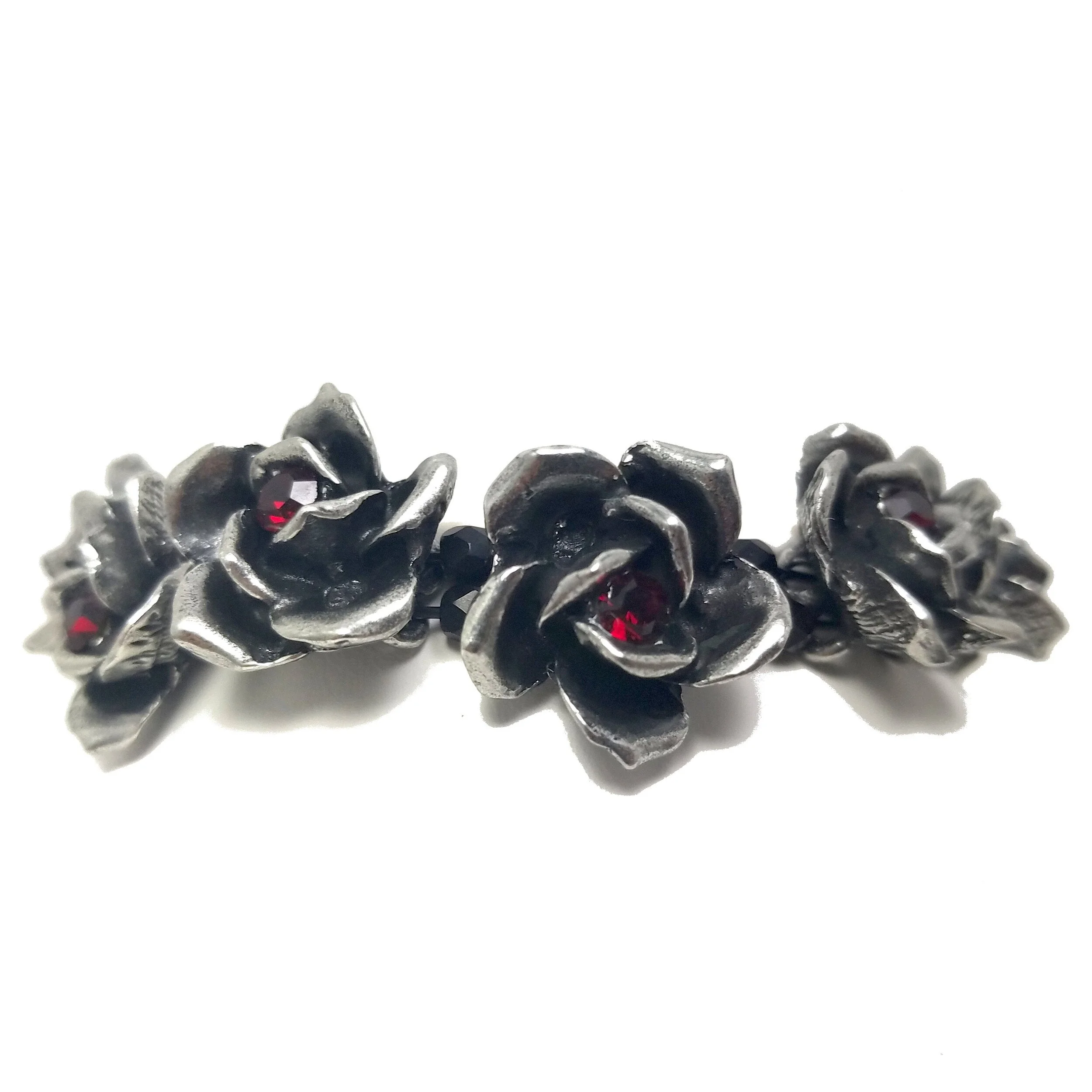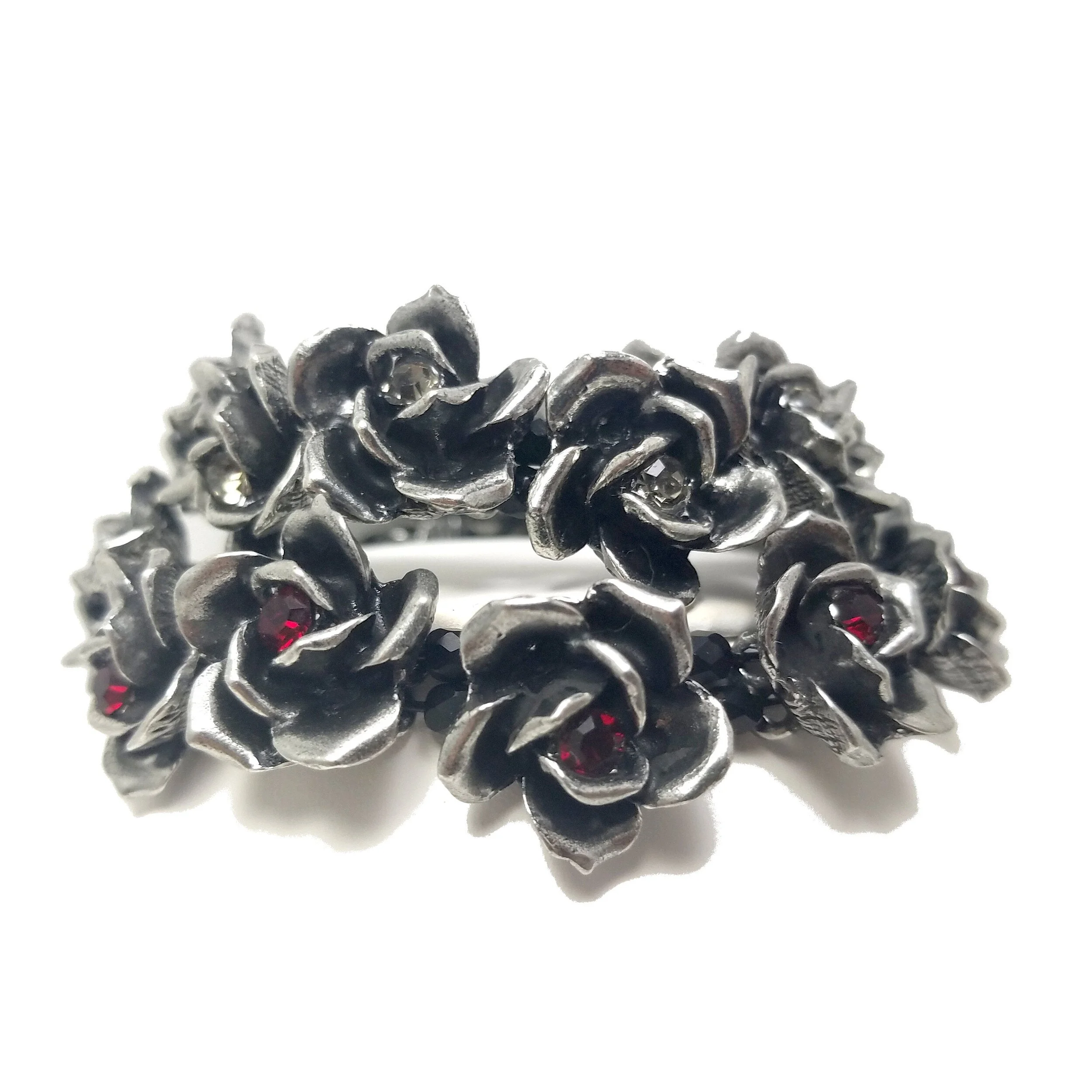 Cast roses with Austrian crystal centers & black faceted Czec glass beads stung on strong stretch cord.